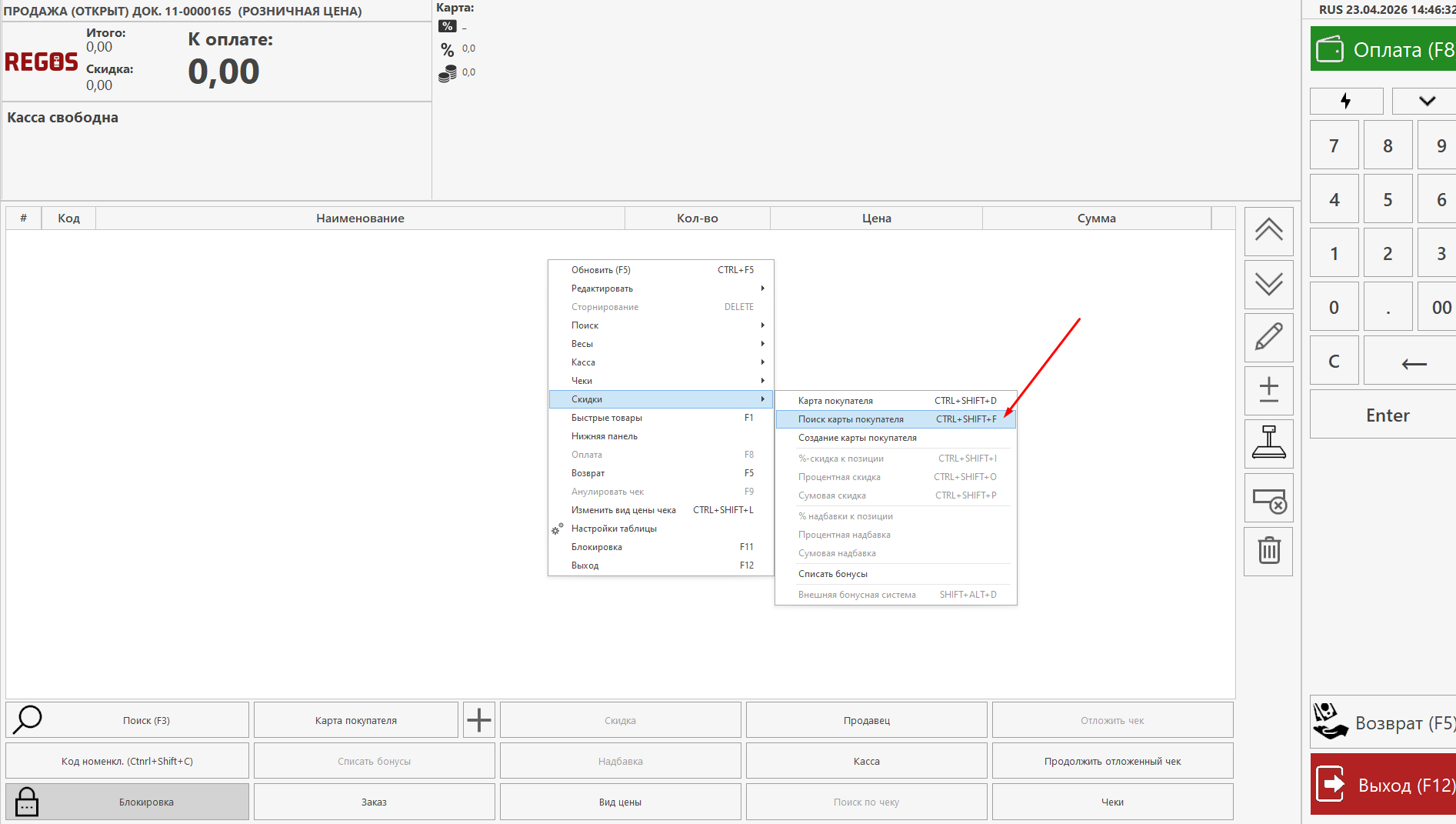 - перейдите в раздел «Скидки → Поиск карты покупателя»