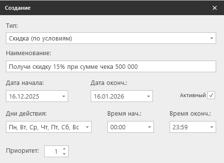 Создайте новую программу, выбрав тип промоакции – Скидка (по условию).