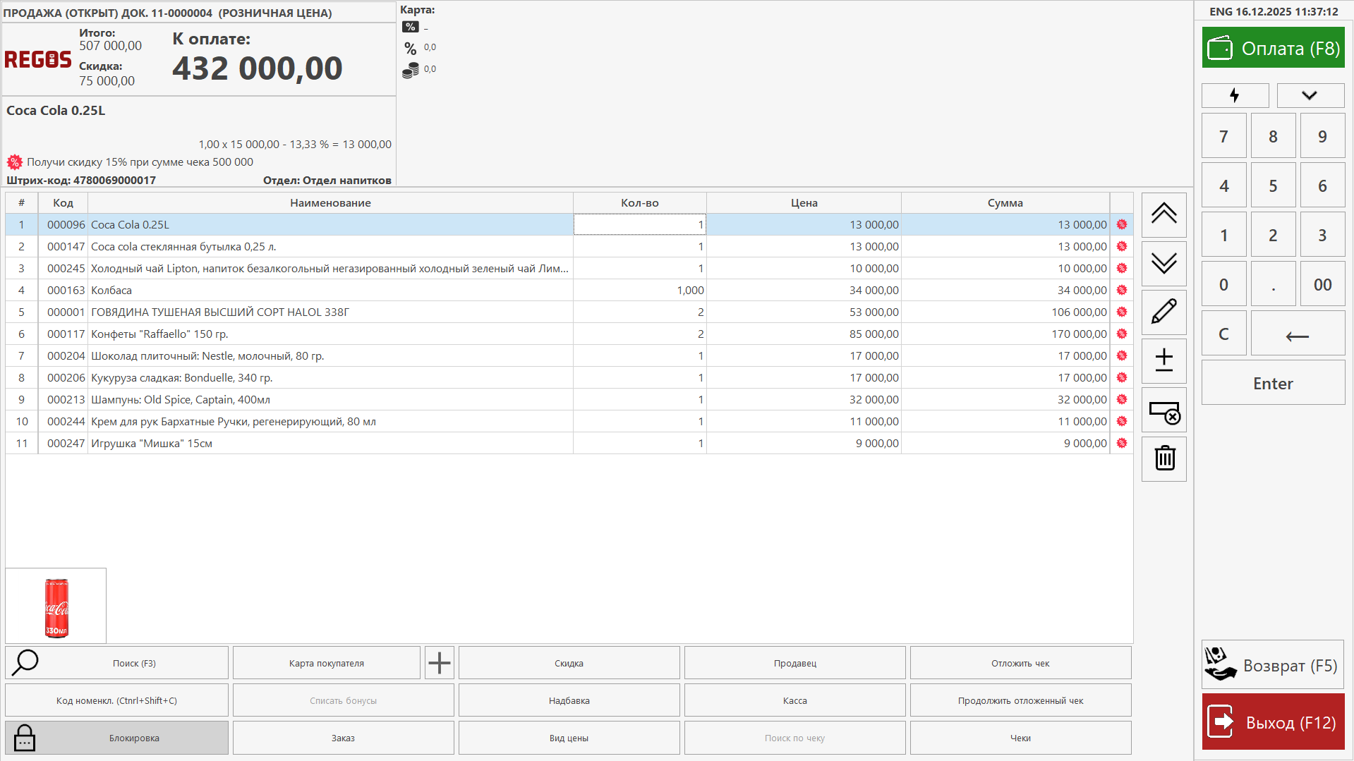 Акция со скидкой 15% при сумме чека от 500 000 – простой способ повысить средний чек и мотивацию покупателей. В Сервисе REGOS её легко настроить, и система автоматически применит скидку на кассе, обеспечивая удобство как для магазина, так и для клиента.