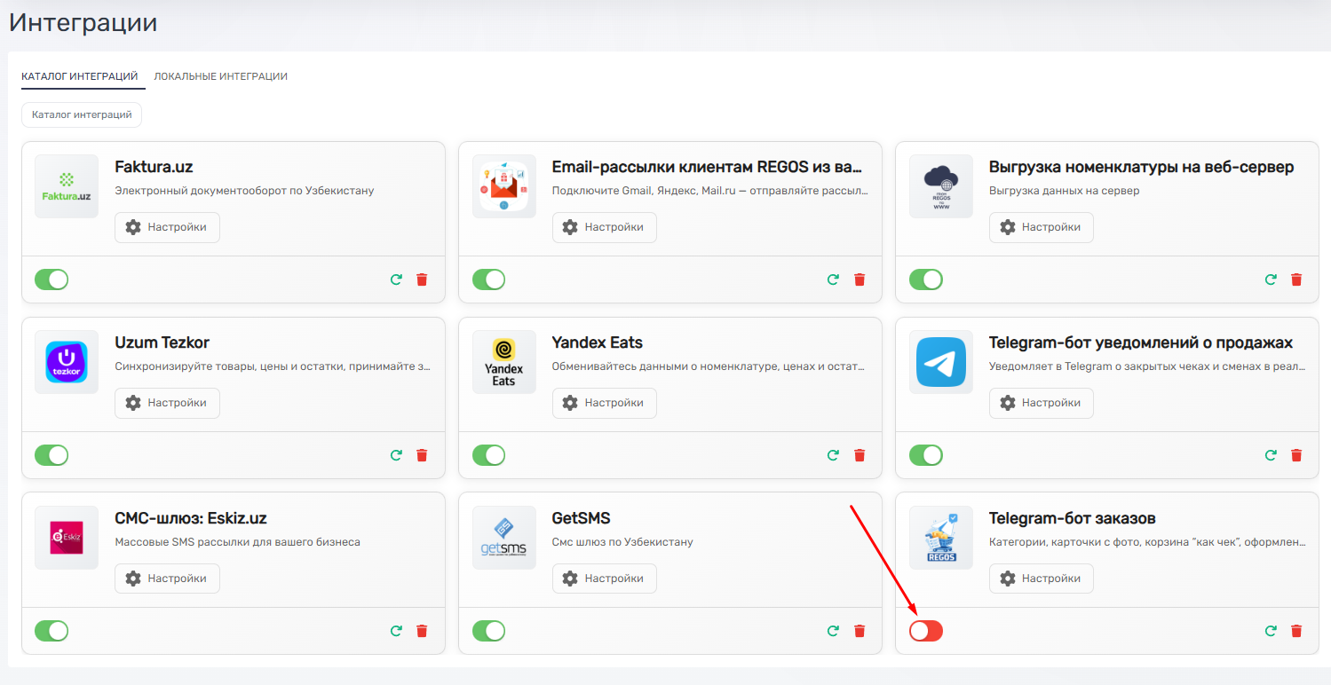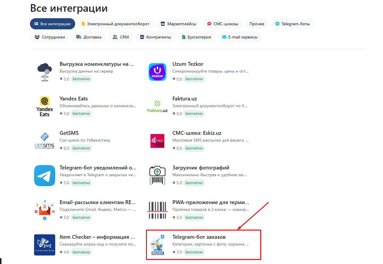 После этого Telegram-бот заказов появится в списке подключённых интеграций.