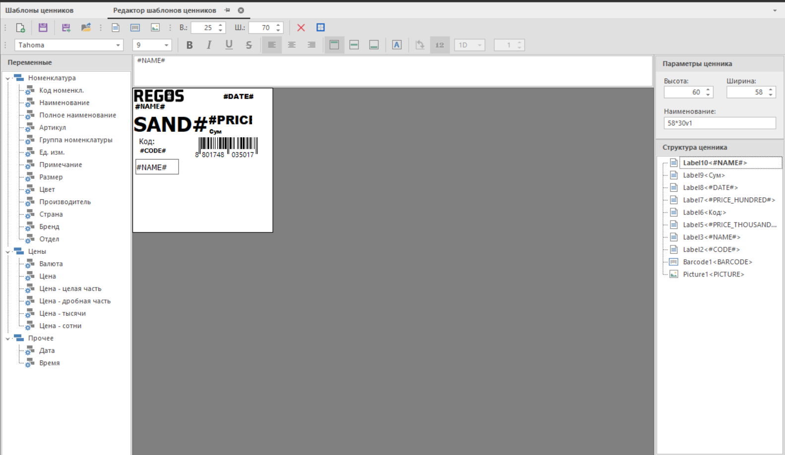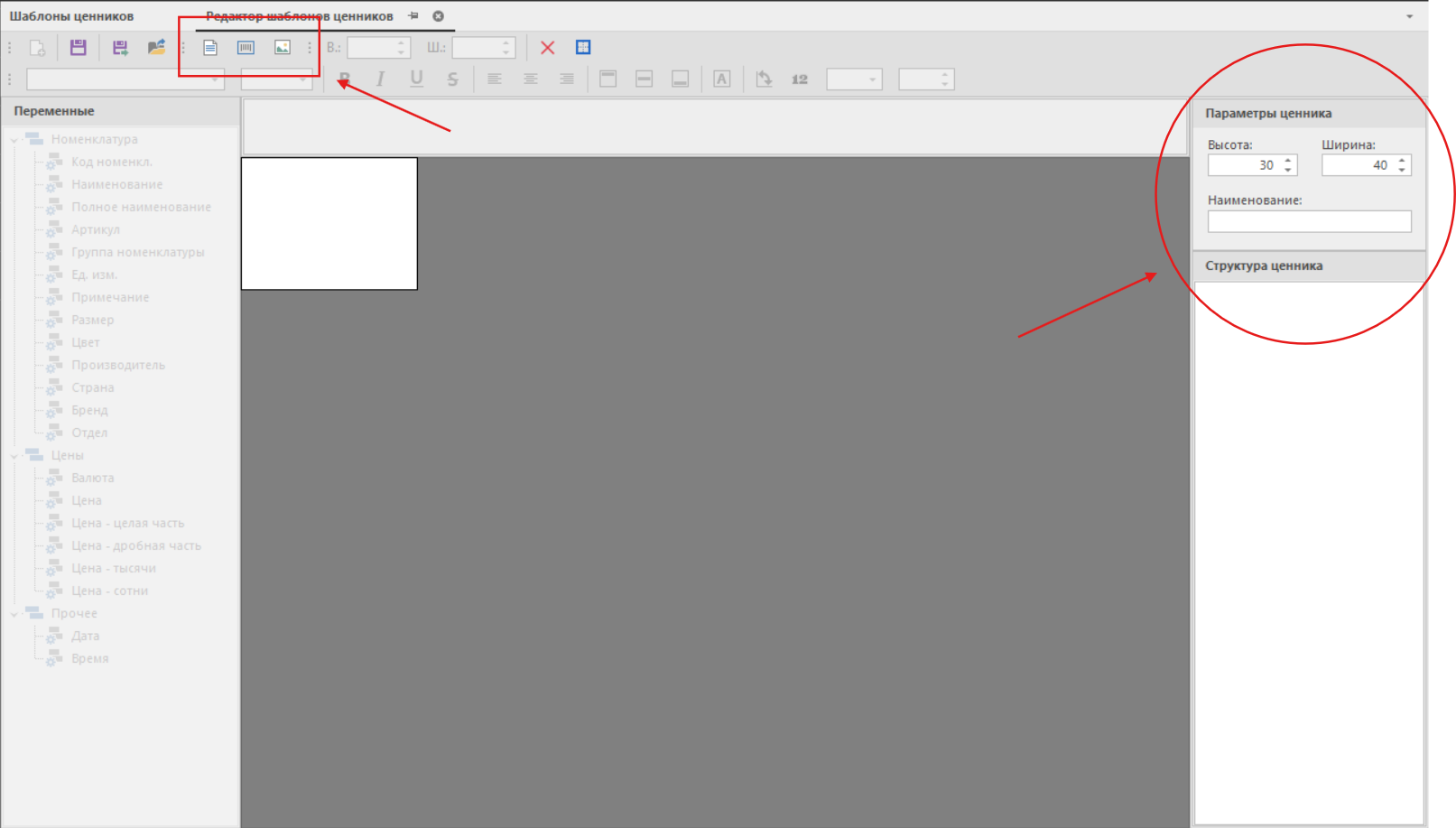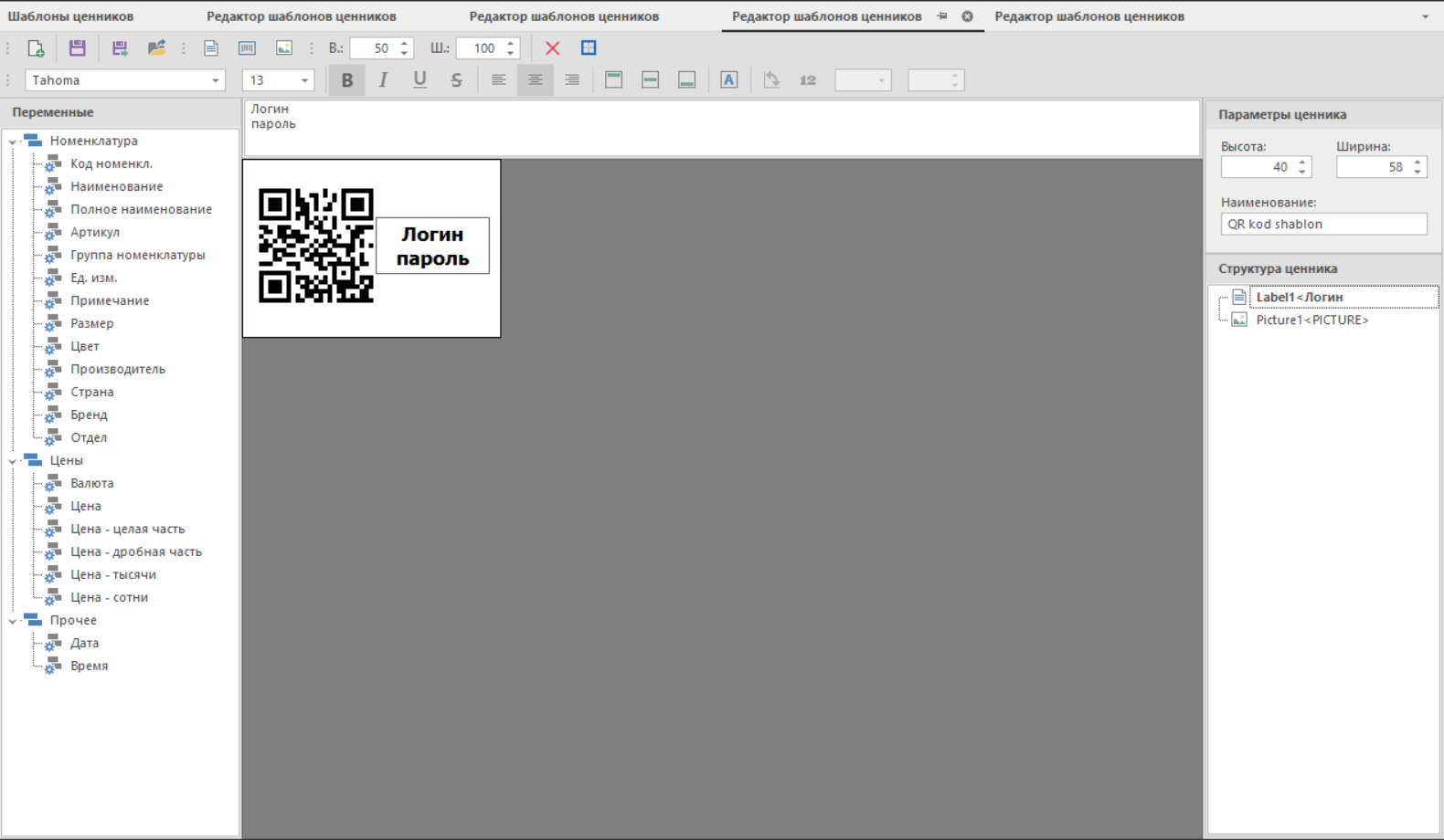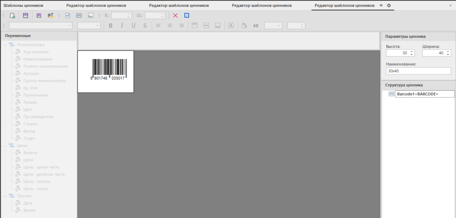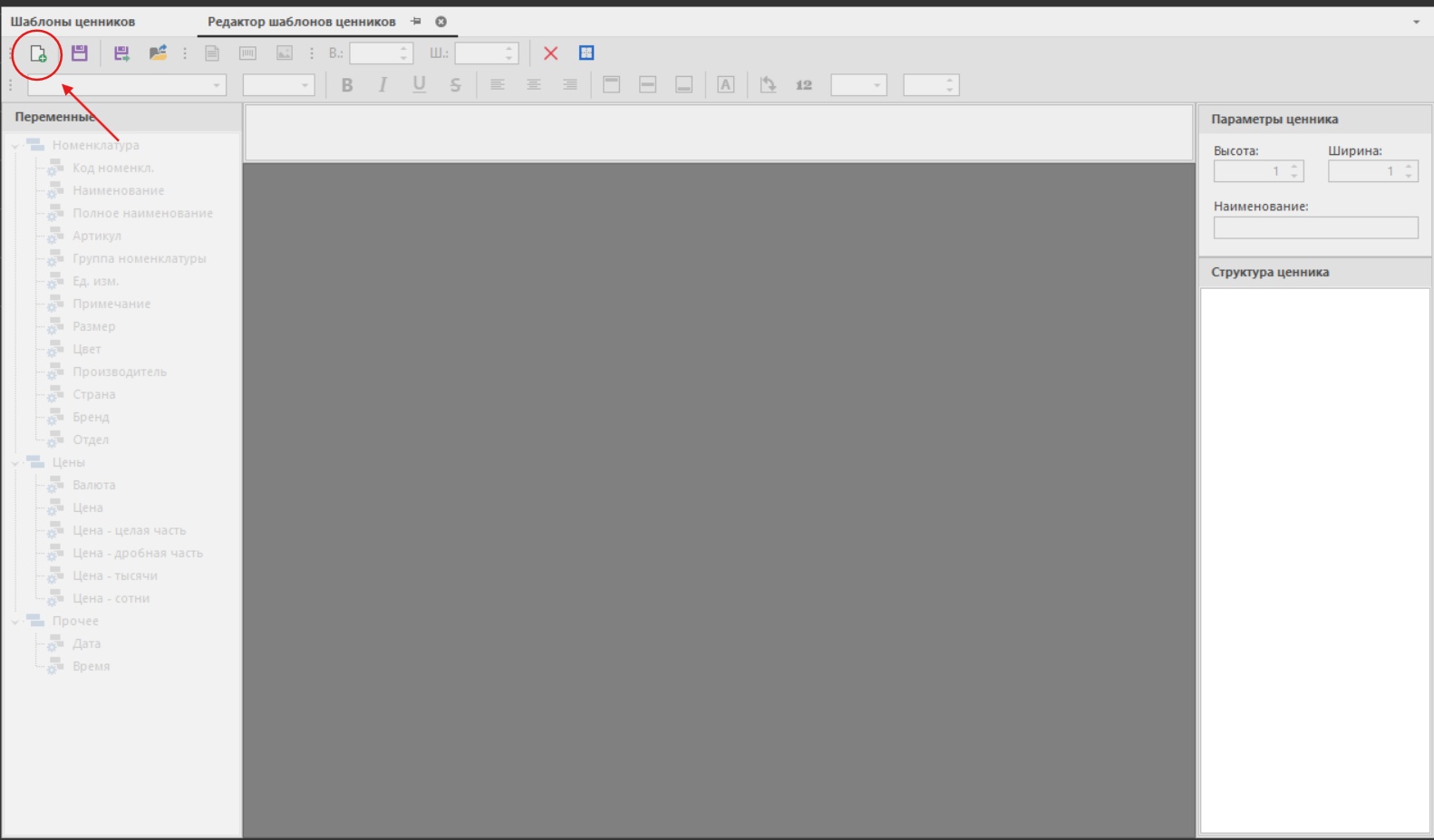 После нажатия откроется редактор ценника, в котором можно создать шаблон.