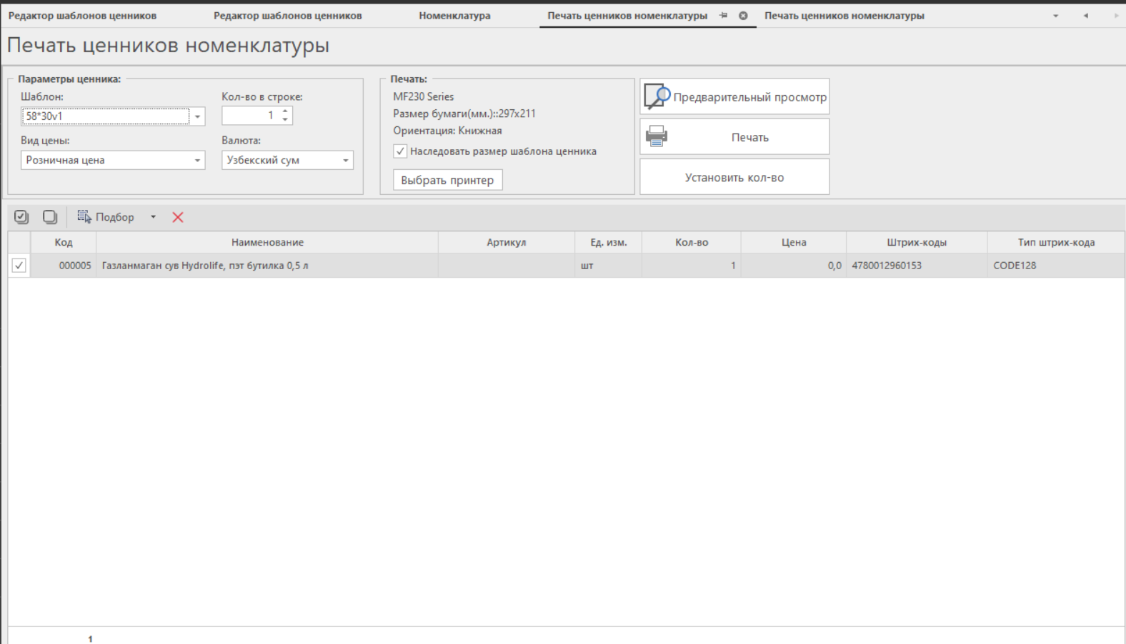 2. В открывшемся окне вы сможете выбрать необходимый шаблон ценника, количество и принтер для печати.