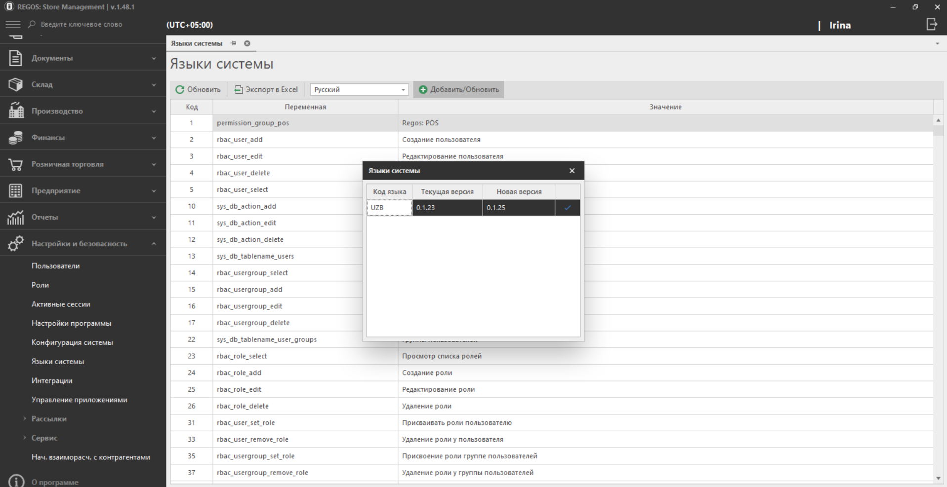 3. Загрузите обновления: Нажмите на зеленую галочку, чтобы загрузить актуальные языковые обновления. Для корректного применения обновлений рекомендуется выйти из системы REGOS: Store Management и снова войти.