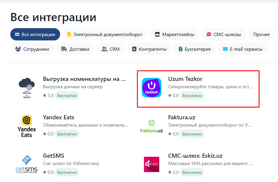 Каталог служит точкой доступа к интеграциям, которые могут расширять функциональность аккаунта Сервиса REGOS или связывать с другими системами.