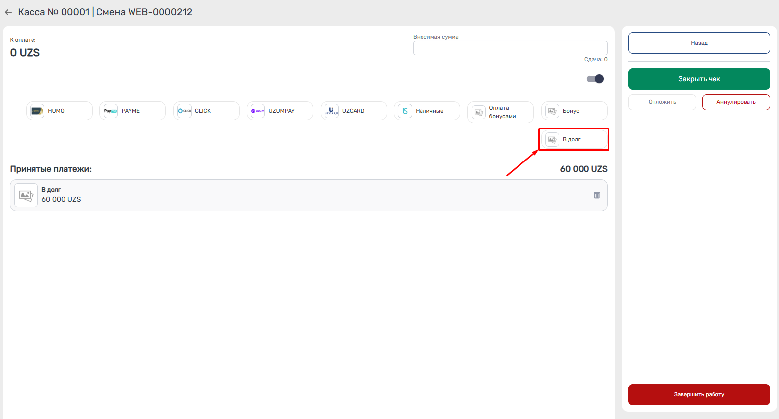 На этапе выбора способа оплаты необходимо выбрать «Продажа в долг».