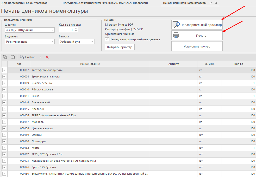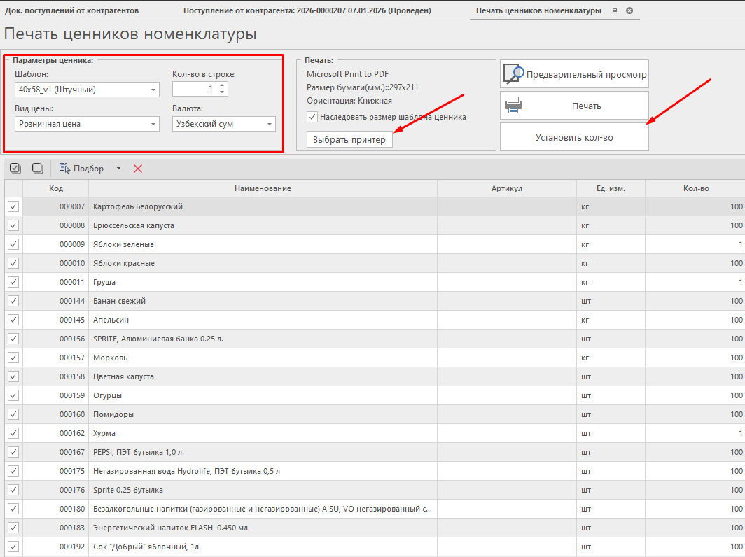 Система автоматически откроет окно печати ценников по номенклатуре из документа