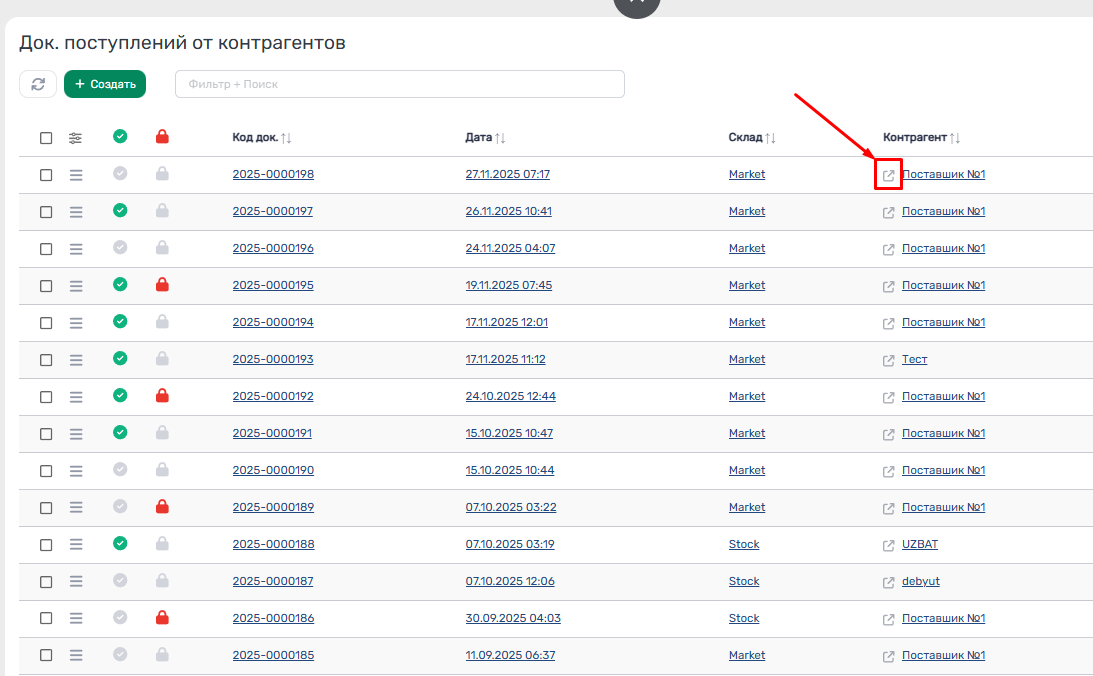 2. Реализована быстрая фильтрация по дате, контрагентам, складам и статусам – достаточно нажать на нужный элемент в колонке.