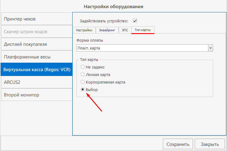 Теперь при выборе способа оплаты «Пластиковая карта» система автоматически предлагает указать тип карты:
