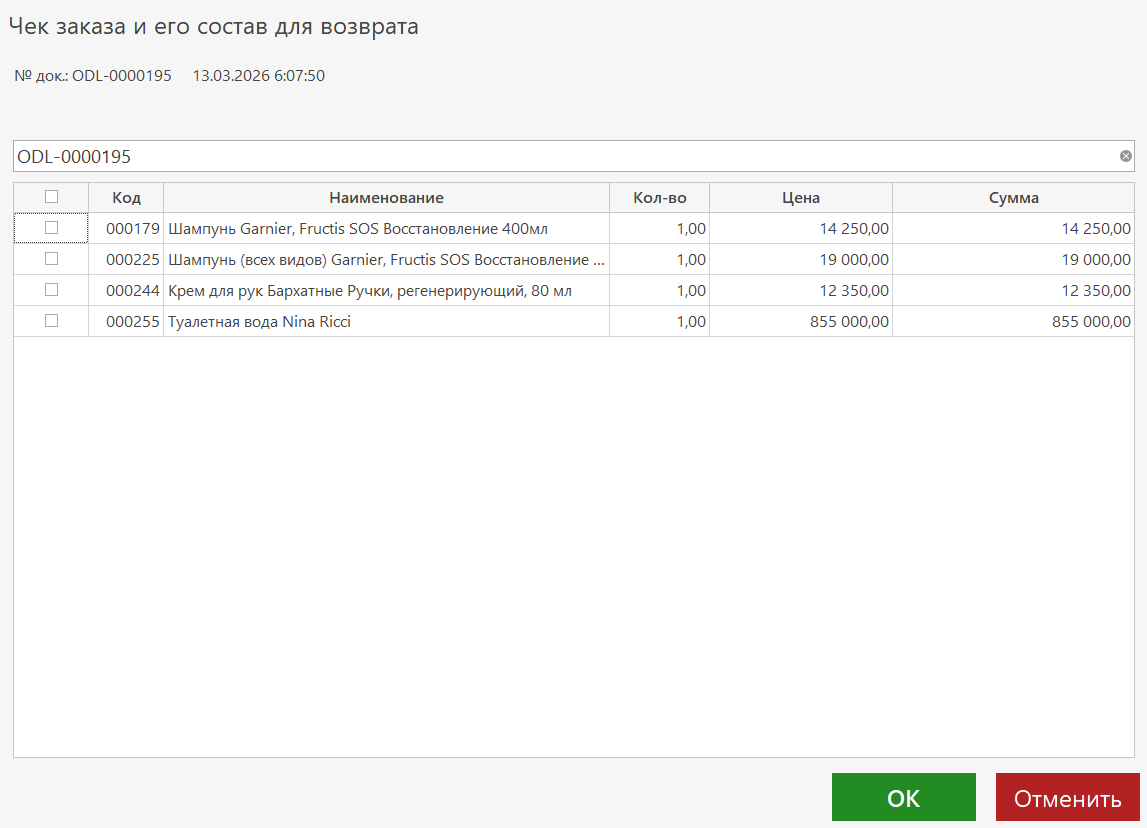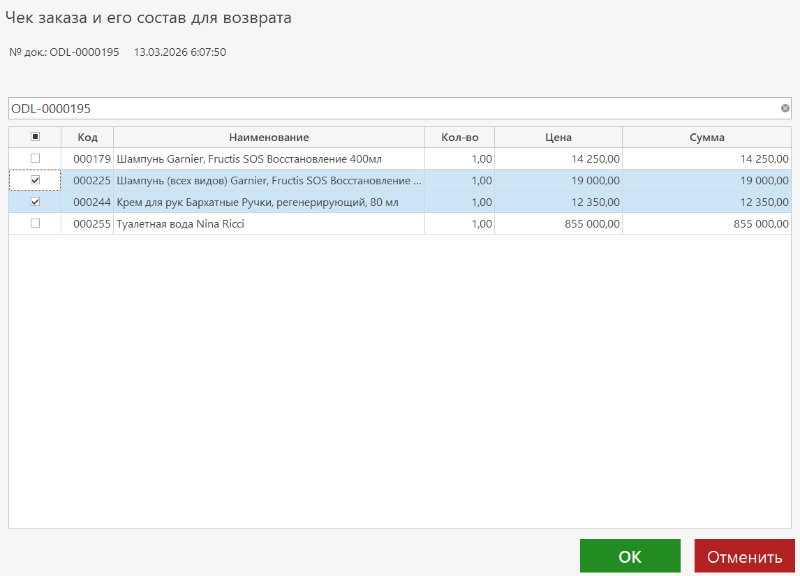 4. Выберите позиции для возврата