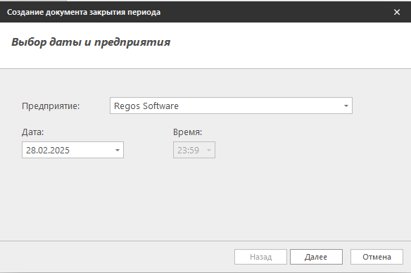 - Предприятие — это наименование предприятия, для которого создается документ закрытия периода.