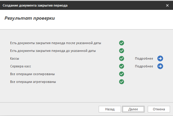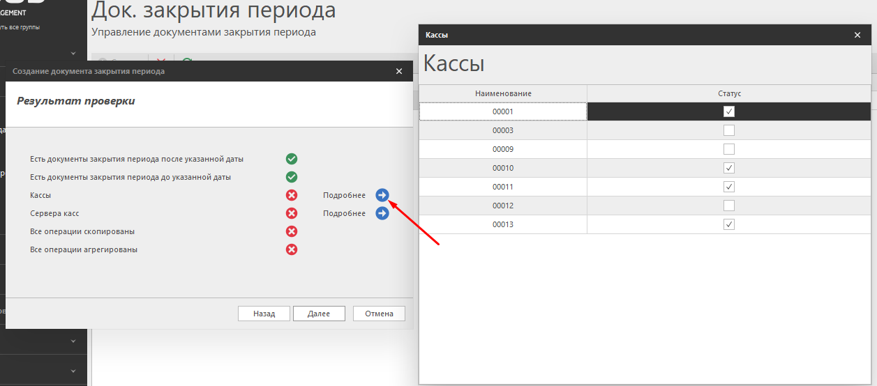 Если проверка проходит успешно, программа даст возможность продолжить процесс закрытия. В случае, если проверка не удовлетворительна, можно получить информацию о том, на каких кассах смены не были закрыты и на каких серверах касс не прошла синхронизация. Для этого достаточно нажать кнопку "Подробнее".