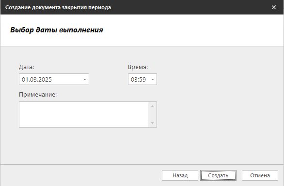 4. При выборе даты выполнения закрытия периода система автоматически выставит дату следующего дня для завершения операции.