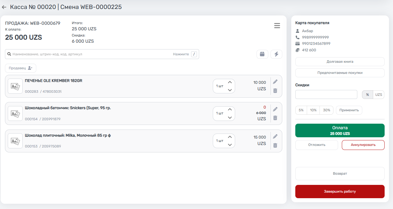 Kassir “Qandolat mahsulotlari” kategoriyasidan 3 ta mahsulotni skaner qiladi – tizim avtomatik ravishda ulardan biriga 100% chegirma qo‘llaydi.