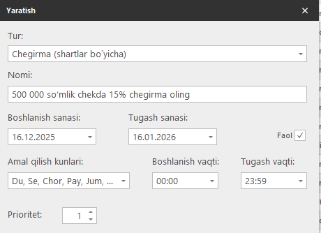 Yangi dastur yarating va promoaksiya turi sifatida Chegirma (shart bo‘yicha) ni tanlang.