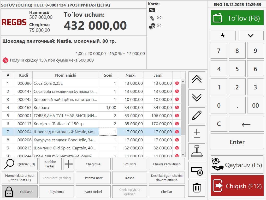 Agar kassir 500 000 so‘m yoki undan yuqori summaga chek urib bersa, tizim avtomatik ravishda 15% chegirmani qo‘llaydi.