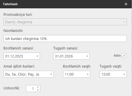 Aksiya amal qilish vaqtini 11:00 dan 15:00 gacha qilib belgilang va chegirma qo‘llanish ustuvorligini tanlang.