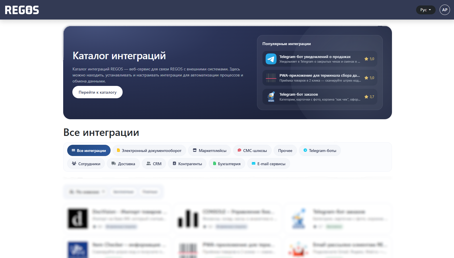Integratsiyalar katalogining bosh sahifasida axborot banneri paydo bo‘ldi. Unda REGOS integratsiyalar katalogi nima ekanligi qisqacha tushuntiriladi, shuningdek mashhur integratsiyalar ro‘yxati ularning bahosi bilan birga ko‘rsatiladi. Bu tezroq yo‘naltirish va talabgir yechimlarni tanlashga yordam beradi.