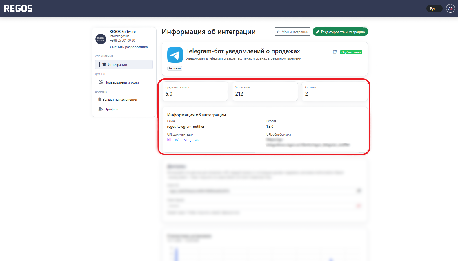 Integratsiya kartochkasida batafsil ma’lumot mavjud: O‘rtacha reyting, O‘rnatishlar soni, Fikr-mulohazalar soni, Integratsiya kaliti, Versiya, Hujjatlar URL manzili, Ishlovchi URL manzili.
