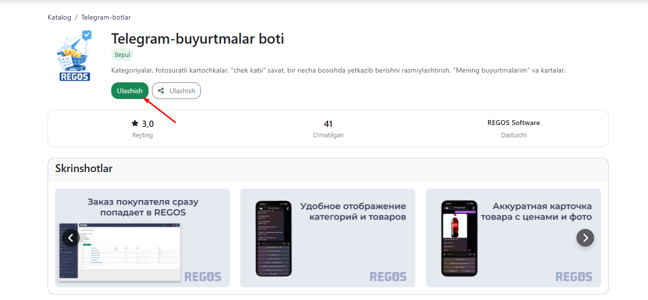 REGOSdagi Telegram buyurtma boti, qolgan zaxira va mijozlar ma'lumotlarini avtomatik sinxronlashtirish orqali chakana buyurtmalarni qabul qilish uchun qo'shimcha kanalni taqdim etadi. Integratsiya sizga barcha buyurtmalaringizni bir joyda boshqarish imkonini beradi va o'rnatishdan so'ng darhol foydalanishga tayyor.