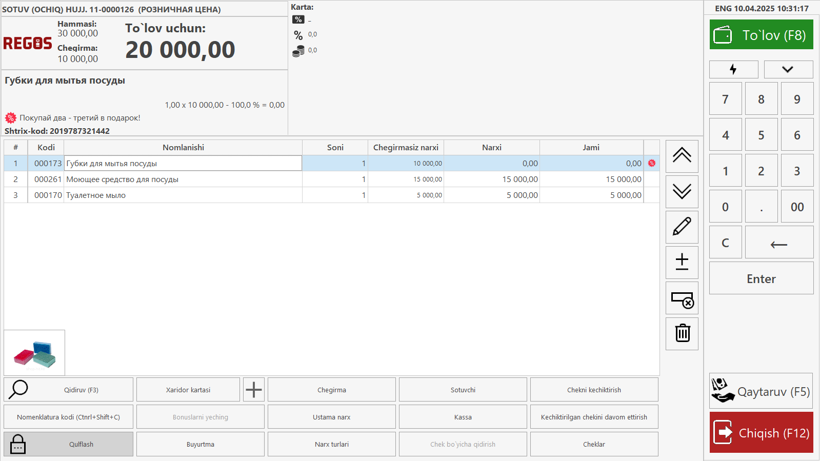 3. Kassada tekshiring. Xaridor uchta mahsulotni tanlasa, kassir ularni chekda skanerlaydi. Tizim avtomatik ravishda "Ikkita mahsulot sotib oling, uchinchisi bepul" aksiyasini qo'llaydi. Chekda ko'rsatilgan birinchi mahsulot bepul deb belgilanadi.