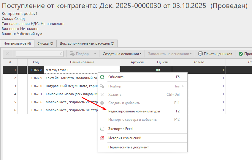 “Nomenklaturani tahrirlash” — hujjat ichida tovar ma’lumotlarini bevosita o‘zgartirish imkonini beradi.