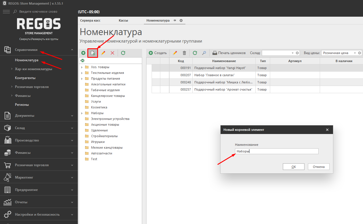 1. Для удобства работы с набором можно создать отдельную группу, куда вы будете добавлять все имеющиеся составные товары. Для этого перейдите в раздел "Номенклатура" и создайте новую корневую группу для составных товаров.