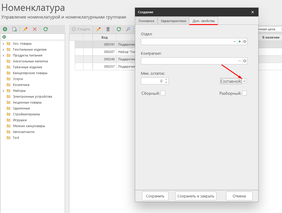 3. На вкладке "Доп. Свойства" установите галочку, указывающую на то, что товар является составным.