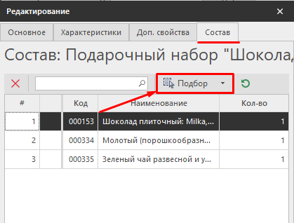 4. После того как товар будет сохранен, откроется вкладка "Состав", где можно добавить все элементы, входящие в состав набора. Выберите товары (шоколад, чай, кофе) через подбор номенклатуры и укажите количество каждой позиции.