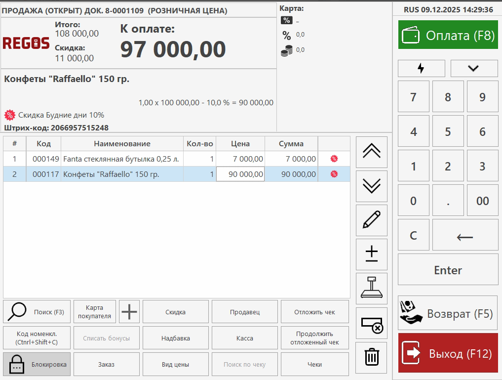 Sozlamalar tugagach, REGOS tizimi avtomatik ravishda 11:00 dan 15:00 gacha barcha tanlangan tovarlarga 10% chegirma qo‘llaydi.