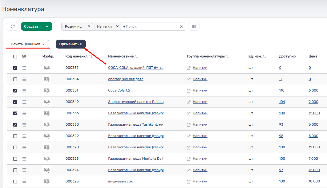 Siz bir vaqtning o'zida nomenklaturadan bir nechta mahsulotlarni tanlab, tanlangan barcha mahsulotlar uchun narx yorliqlarini bir vaqtning o'zida chop etishingiz mumkin.