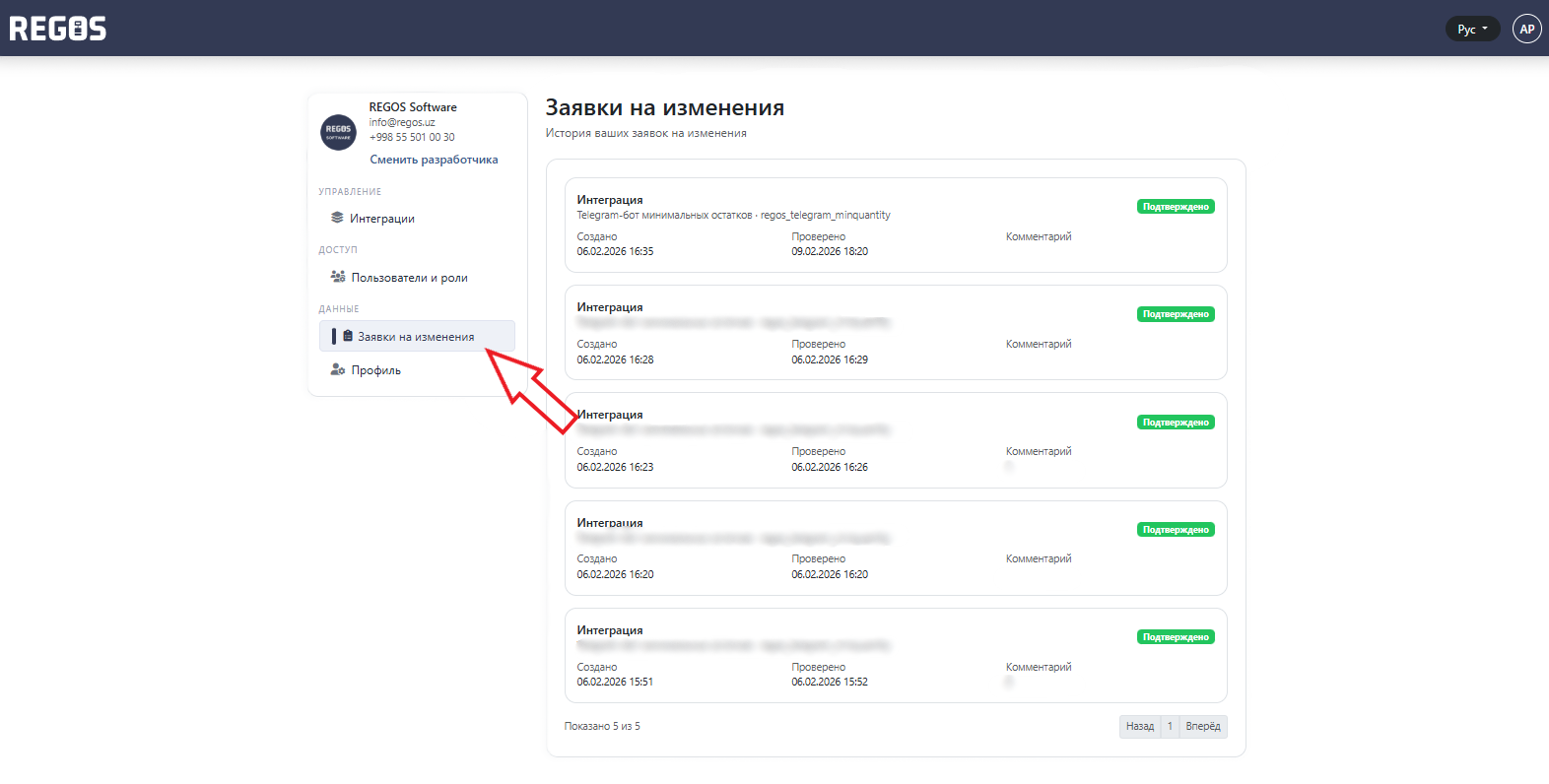 Ishlab chiquvchi o‘zgartirishlar bo‘yicha arizalar ro‘yxatini ko‘rishi va arizalar holatini (tasdiqlangan yoki rad etilgan) kuzatishi mumkin.