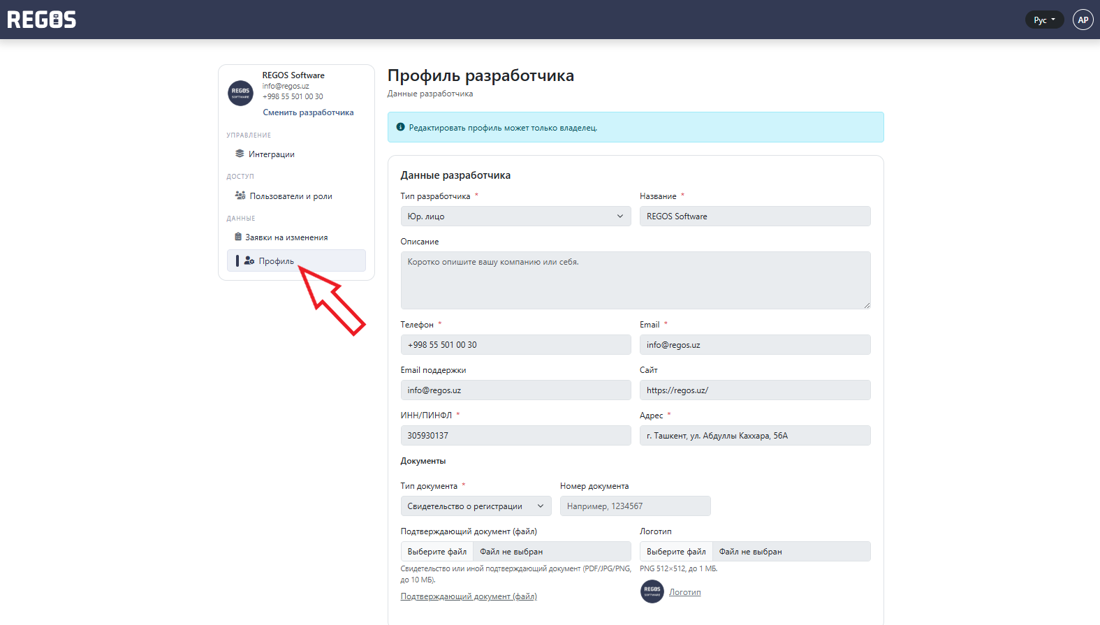 REGOS’da Ishlab chiquvchi profili – bu integratsiyalarni yaratish, nashr qilish va qo‘llab-quvvatlash uchun to‘liq vosita bo‘lib, ishlab chiquvchilar hamda foydalanuvchilar uchun xavfsizlik va qulaylikni ta’minlaydi.
