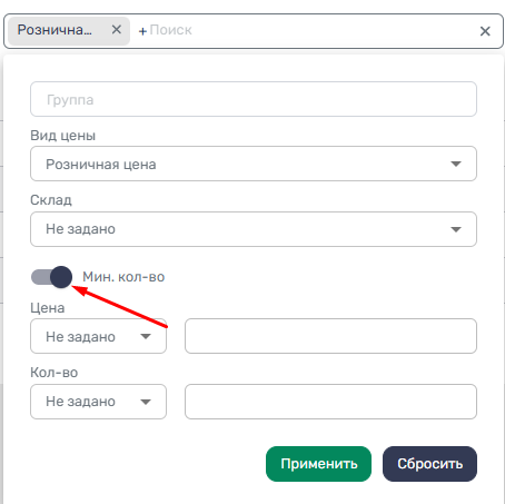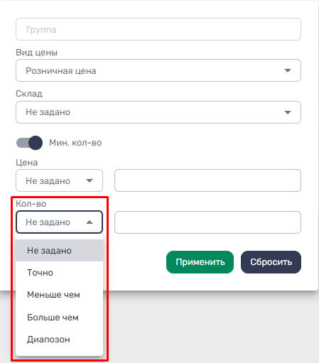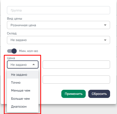 Nomenklatura bo‘limida narx bo‘yicha kengaytirilgan filtr paydo bo‘ldi, u to‘rtta rejimda ishlaydi: