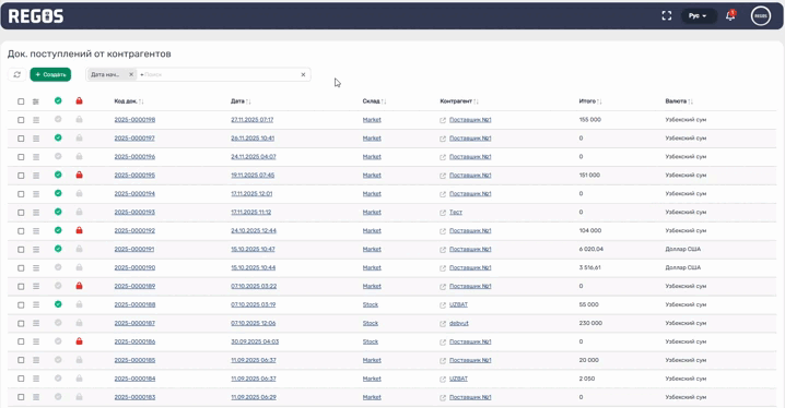 2. Sana, kontragentlar, omborlar va statuslar bo‘yicha tezkor filtrlar joriy etildi kerakli element ustiga bosish kifoya.