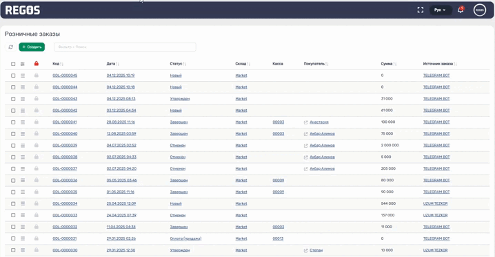 2. Ustunlardagi elementlarni bosish orqali kassa, ombor, sana, buyurtma manbai, mijozlar va statuslar bo‘yicha filtrlar ishlaydi.