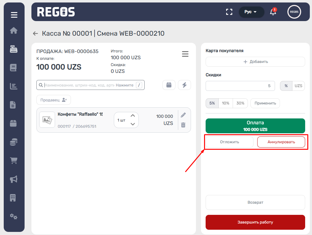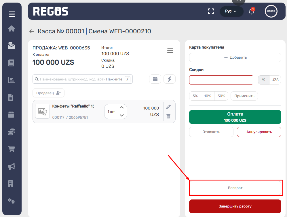 8. “Qaytarish” tugmasi kassirning asosiy ekraniga chiqarildi.