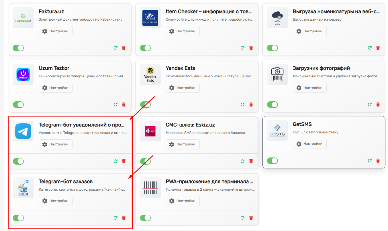 Xabarnomalar, chakana buyurtmalar va bonus kartalar bo‘yicha Telegram-botlar ishlashdan to‘xtatildi. Ularning o‘rniga Integratsiyalar katalogi (apps.regos.uz) orqali integratsiyalar joriy etildi.
