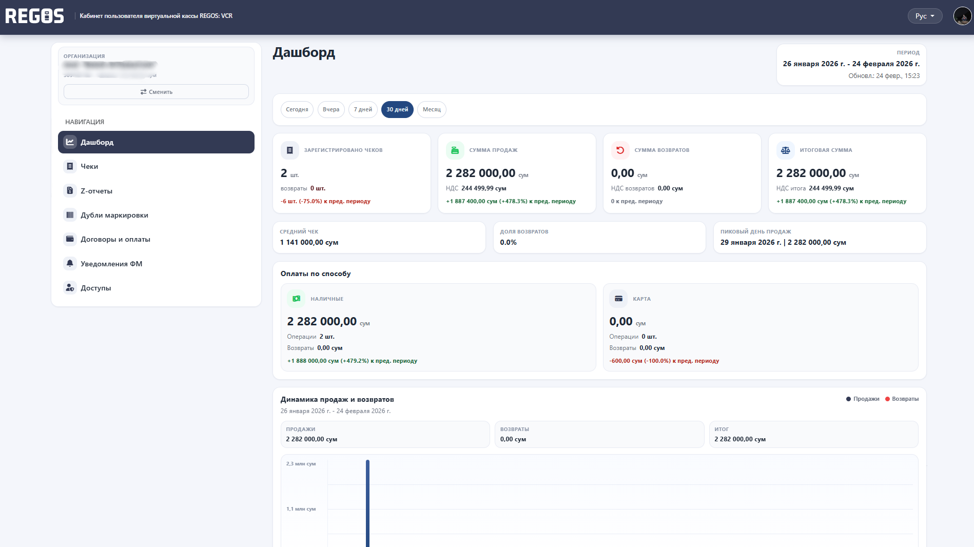 Sahifada davr bo'yicha filtrlar mavjud: Bugun, kecha, 7 kun, 30 kun va hozirgi oy. Asosiy ko'rsatkichlar ko'rsatiladi: savdo cheklar soni, savdo va qaytarishlar soni, umumiy miqdor, o'rtacha chek, qaytarishlar ulushi, savdo eng yuqori kuni, savdo miqdorini ko'rsatuvchi usullar (naqd pul va karta) bo'yicha to'lovlar, har bir usul uchun tranzaksiyalar soni va qaytarishlar soni, shuningdek, savdo va qaytarishlar dinamikasi.