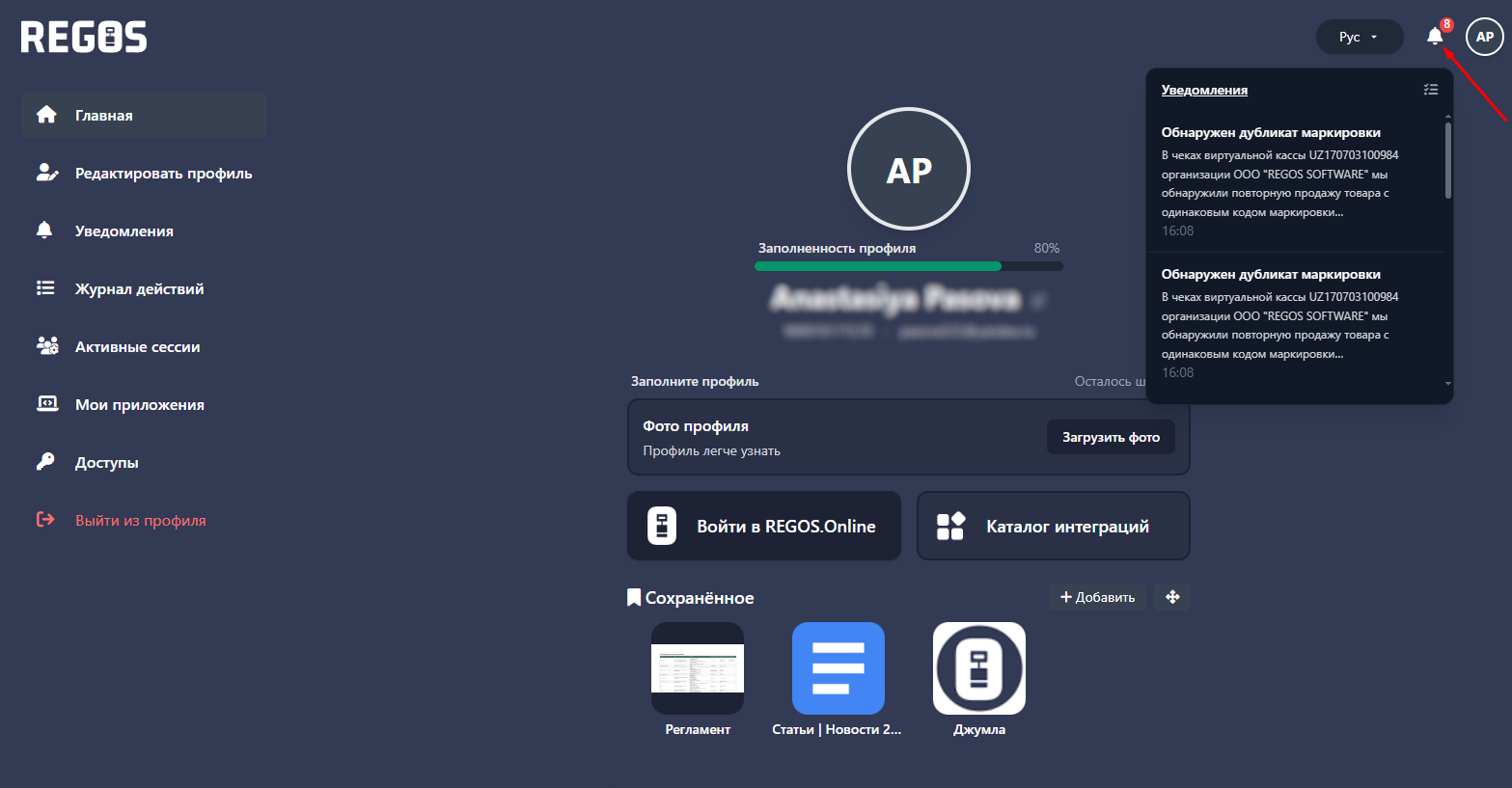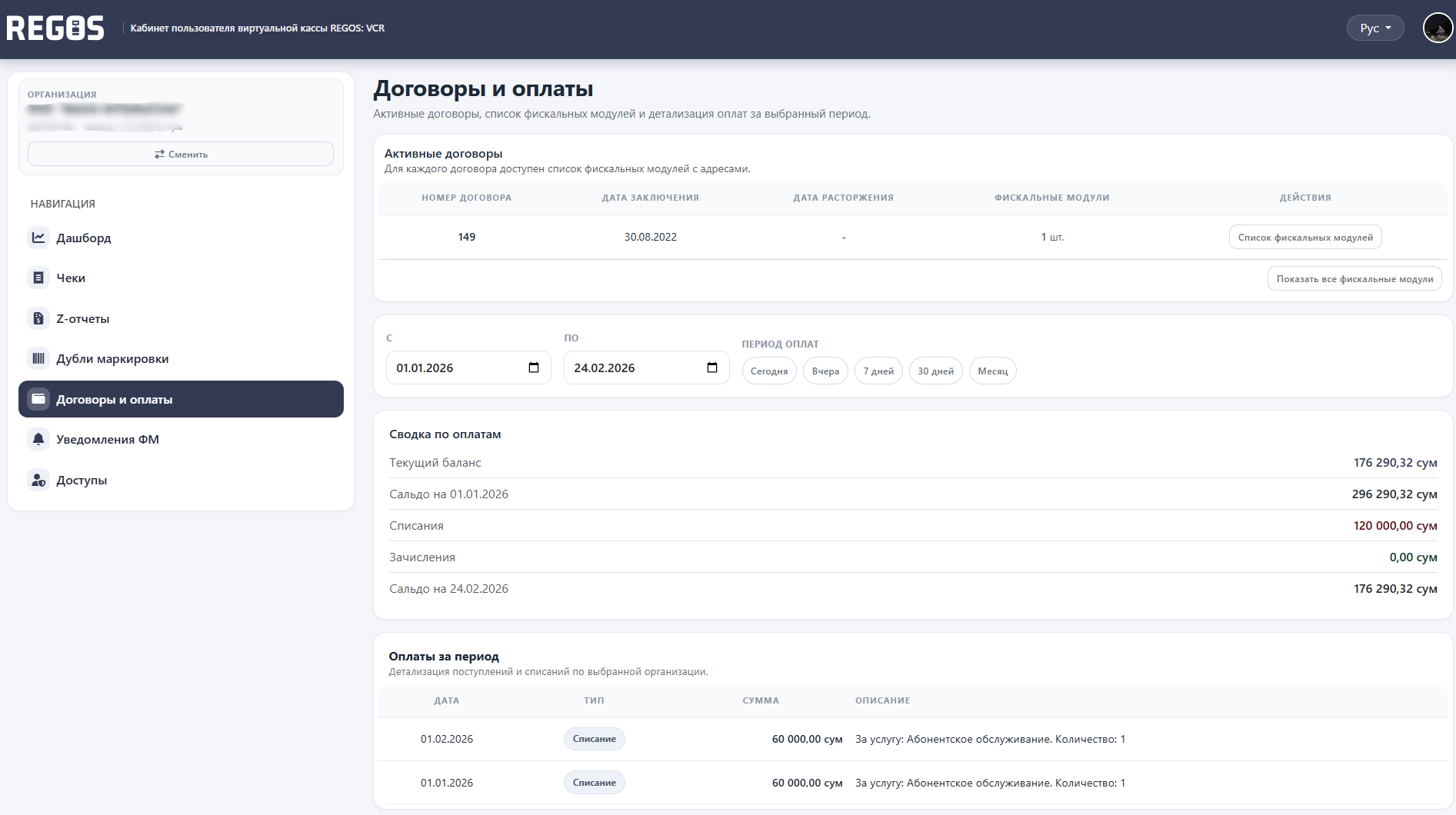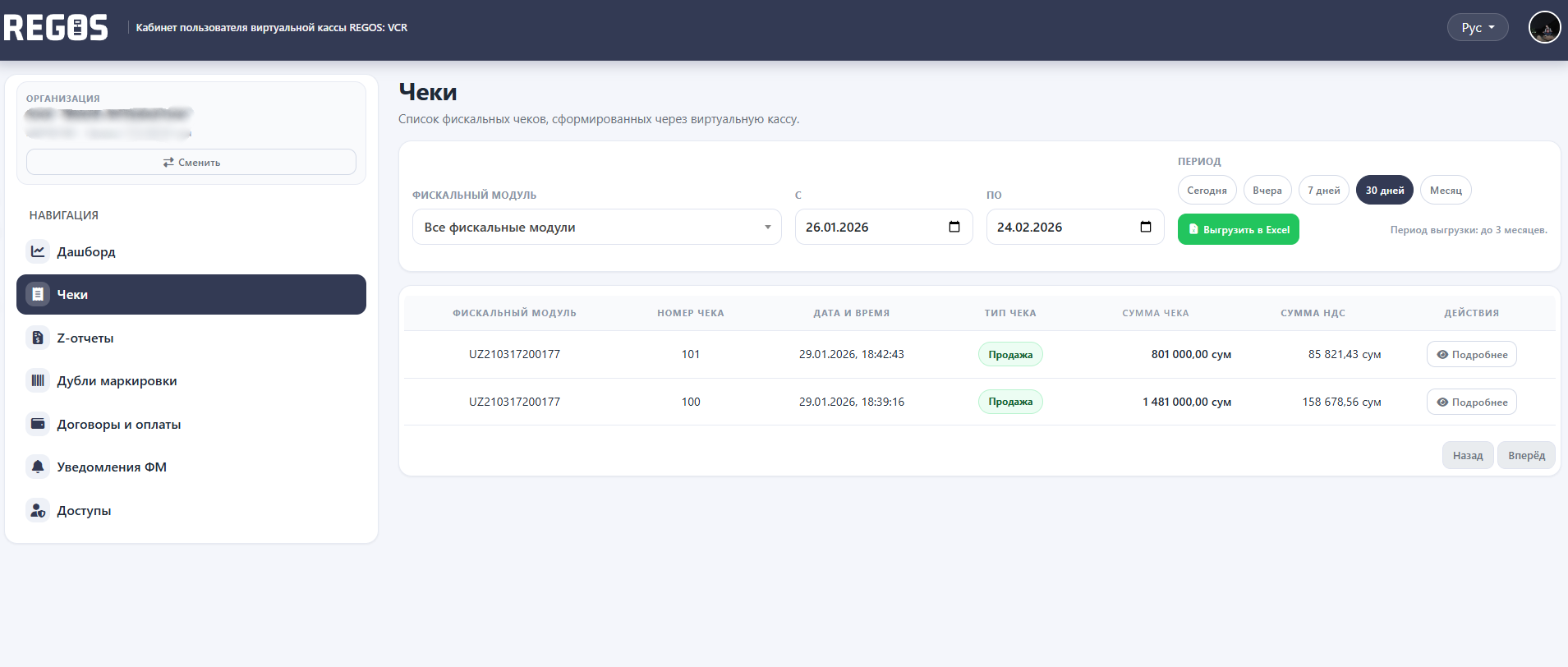 REGOS: VCR virtual kassaning foydalanuvchi hisob raqami savdo, cheklar va moliyaviy tranzaksiyalarni bitta interfeysda boshqarishga yordam beradi. Takroriy belgilar haqida bildirishnomalarga alohida e'tibor qaratiladi, tizim darhol hisobdagi muammoni va push bildirishnomalari orqali xabar beradi. Bu sizga cheklardagi xatolarni tezda tuzatish va jarima qo'yilishi mumkin bo'lgan buzilish xavfini kamaytirish imkonini beradi