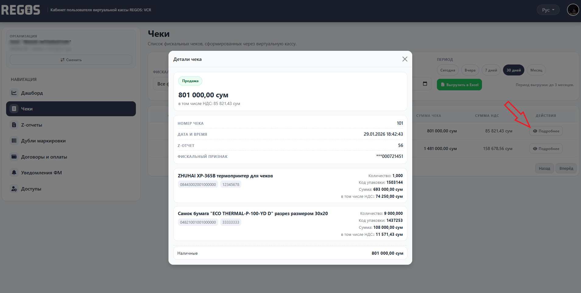 Batafsil cheklar kartasi mavjud bo'lib, unda Z-hisobot, mahsulotlar, MXIK, shtrix-kod, miqdor, miqdor va to'lov shakli haqida ma'lumotlar mavjud.