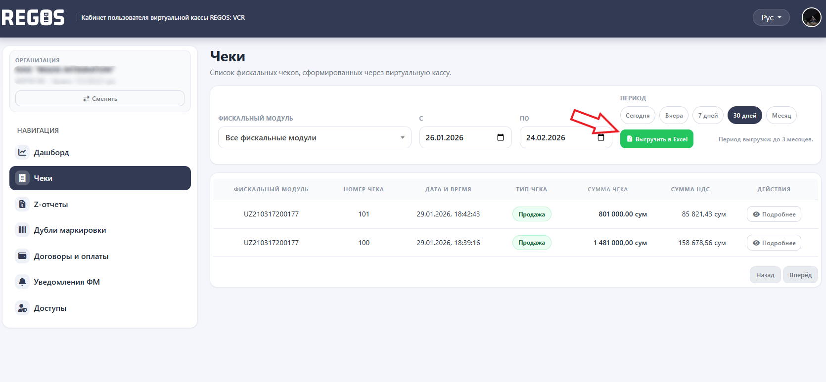 Cheklarni Excel'ga 3 oygacha yuklash mumkin.