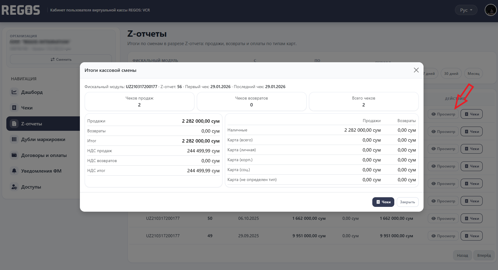 Naqd pul o'tkazish natijalari Z-hisobotlar kontekstida ko'rsatiladi, jumladan savdo, qaytarishlar va karta turi bo'yicha to'lovlar. Moliyaviy modullar va davrlar bo'yicha filtrlash mavjud. Jadvalda moliyaviy modul raqami, Z-hisobot raqami, oxirgi chek soni, savdo miqdori, qaytarishlar va umumiy miqdor ko'rsatilgan.