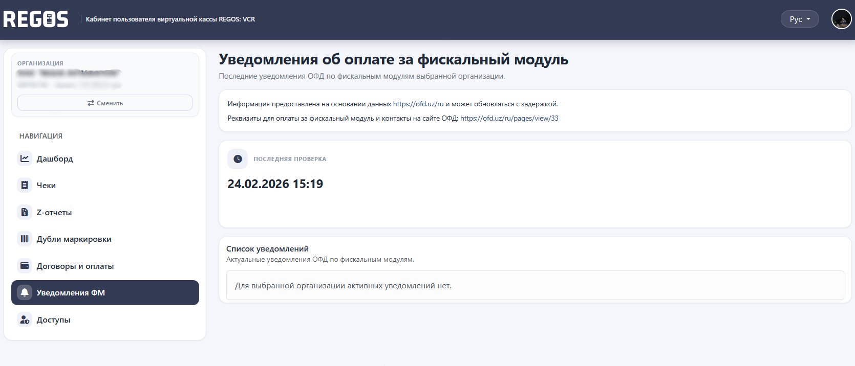 Tanlangan tashkilotning moliyaviy modullari bo'yicha moliyaviy ma'lumotlar operatorining so'nggi bildirishnomalari ko'rsatiladi. Ma'lumotlar https://ofd.uz/ ma'lumotlar asosida taqdim etiladi va kechroq kelishi mumkin.