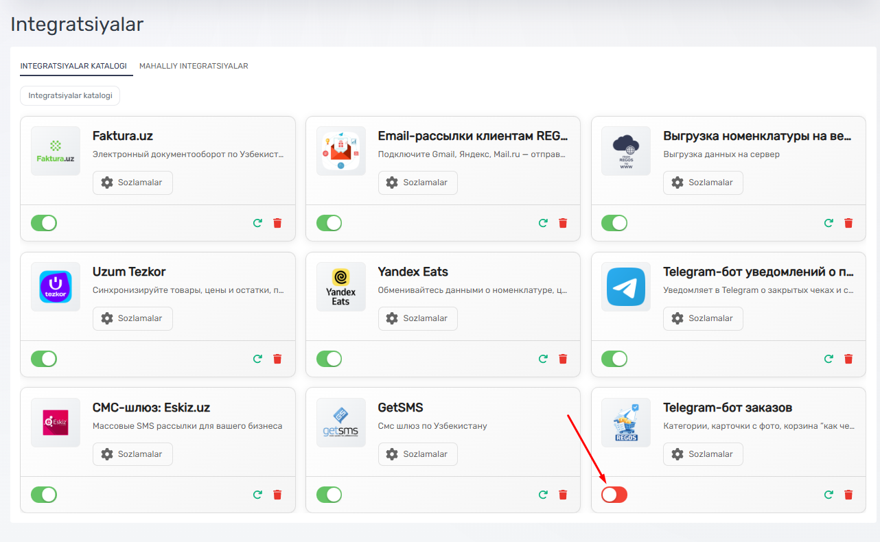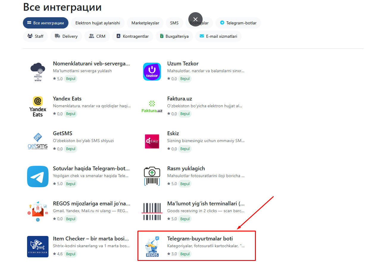 Shundan so'ng, Telegram buyurtma boti ulangan integratsiyalar ro'yxatida paydo bo'ladi.