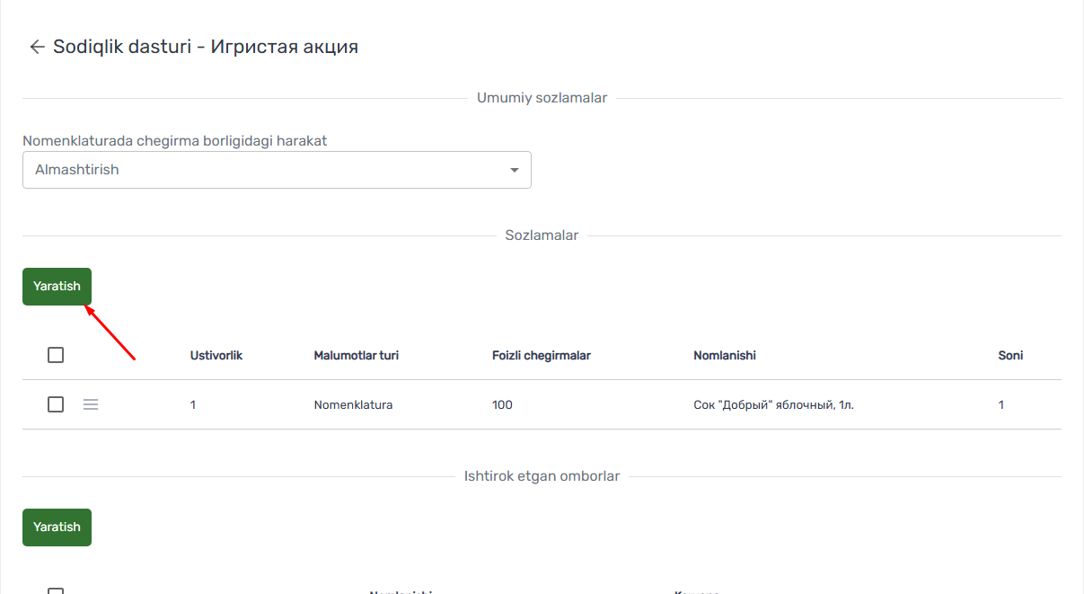 3.3 «Sozlamalar» bo'limida chegirma qo'llaniladigan chek obyektlarini ko’rsating va ustuvorlikni belgilang. 1 quti miqdoridagi olma sharbatiga 100% chegirmani o'rnating.